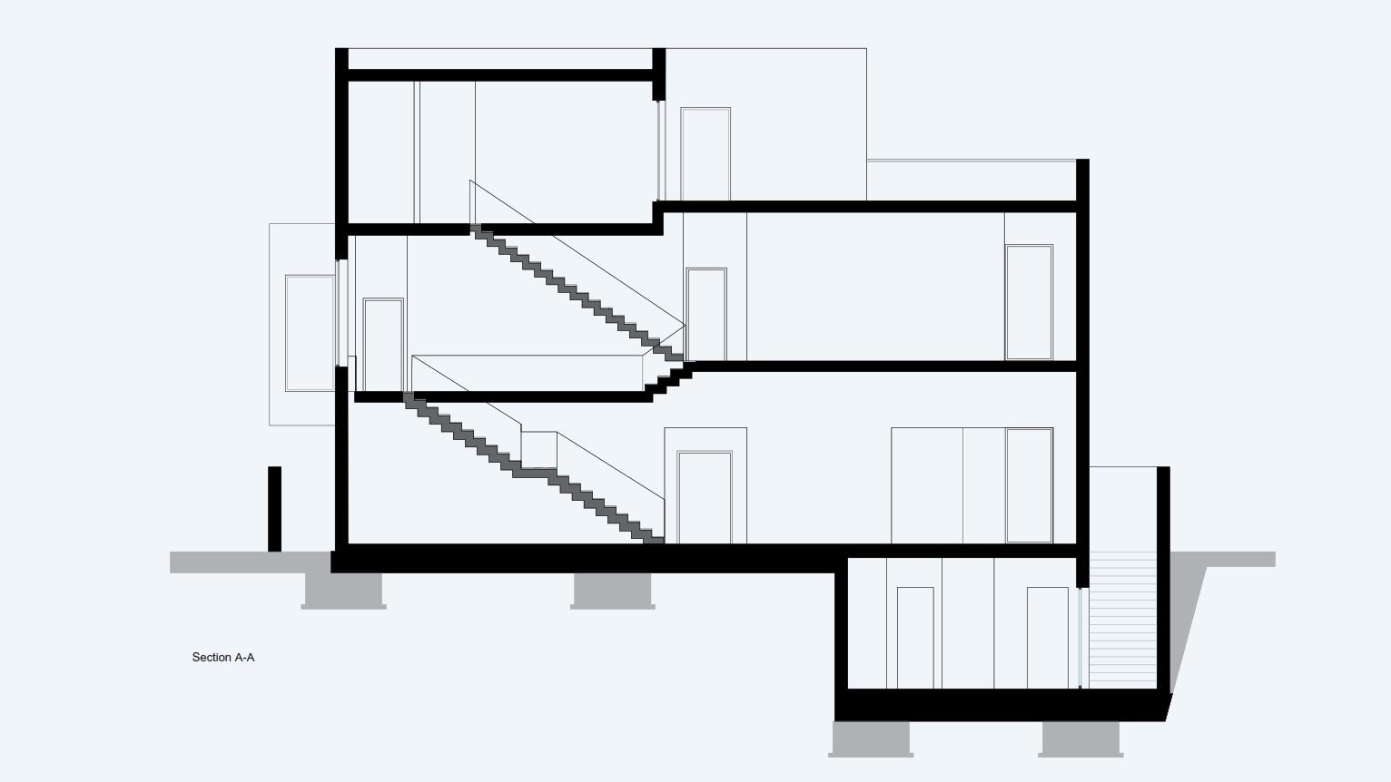 In this design, the communication staircase serves as a fluid and easily navigable pathway. It promotes a seamless connection of the project’s volume with the neighboring twin building. We achieve this integration through the implementation of split levels and a clear separation of access to both private and public spaces.