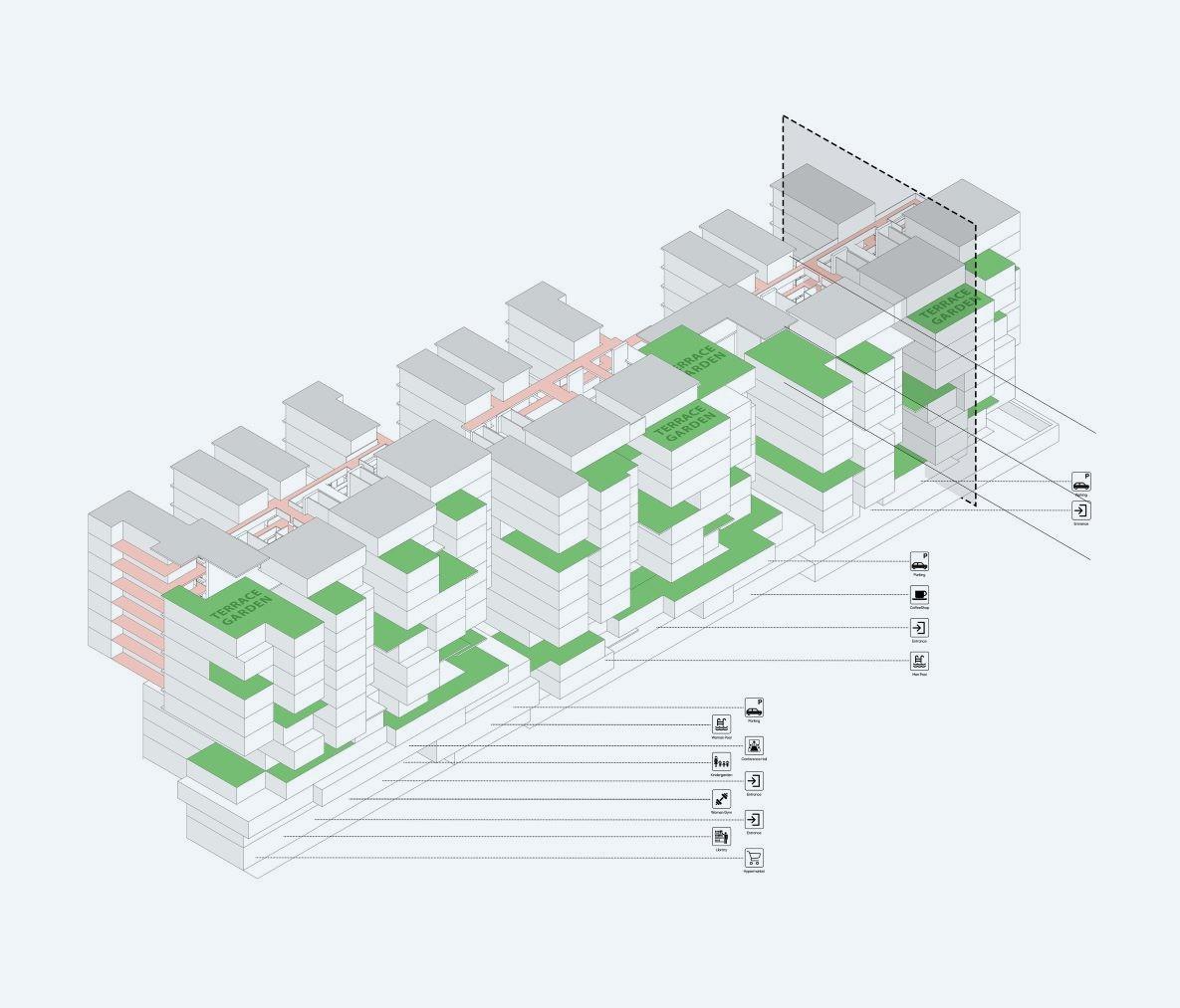 Royal Residential complex project proposes a new housing model, based on Social garden. In contrast to the boxy tower blocks typically found in neighborhoods housing developments, our building has a strong visual presence that combines undulating geometries of social garden.